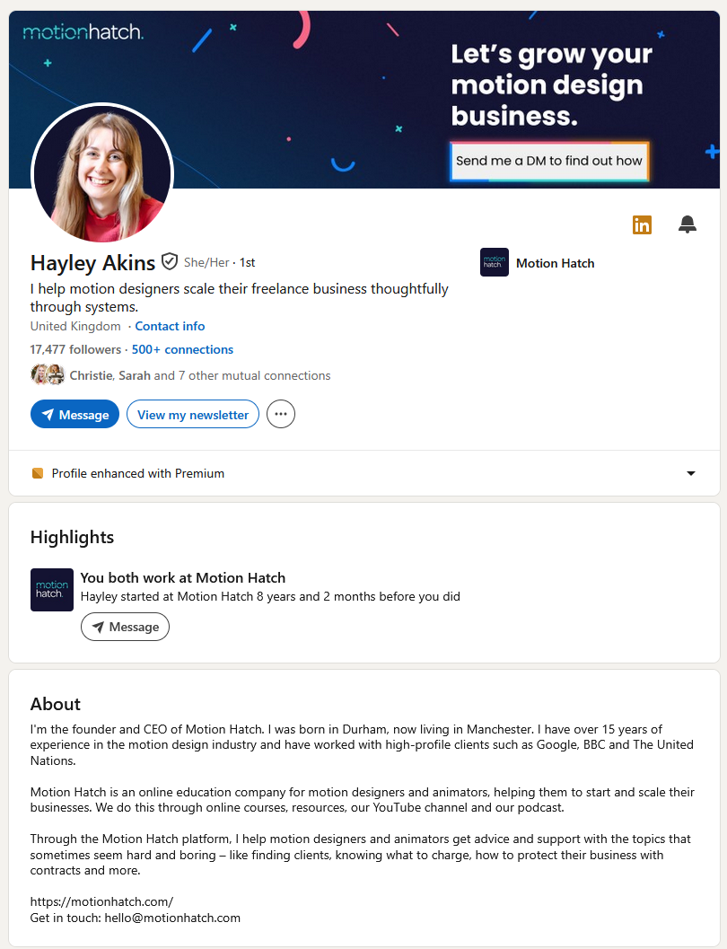 Motion Hatch is an online school for freelance motion graphic designers and animators. We offer courses, resources, a community forum and a bi-weekly podcast and a YouTube channel discussing the ins and outs of the business side of motion design.
